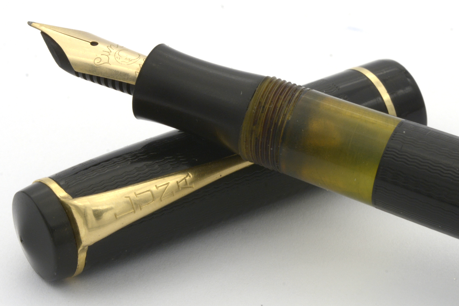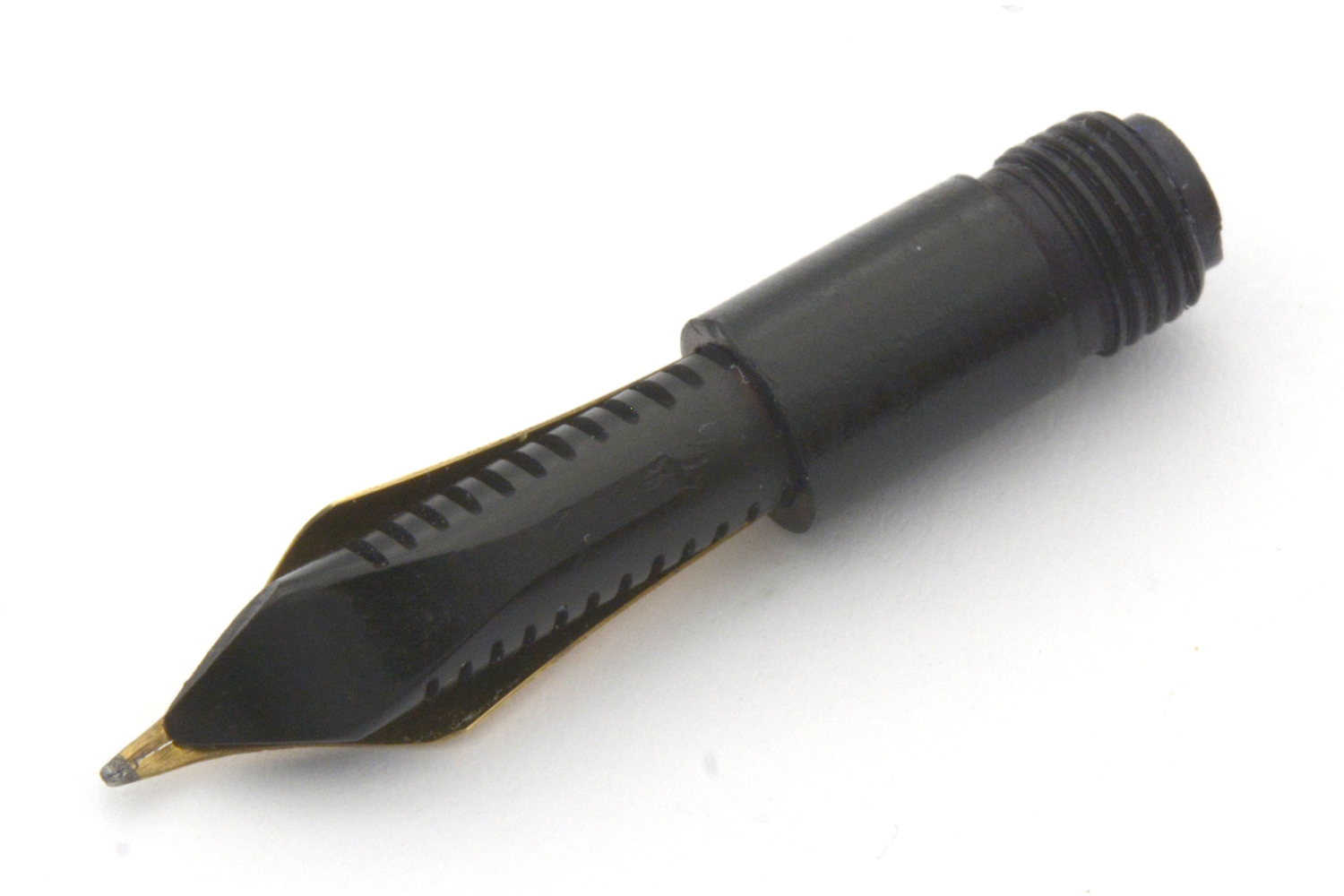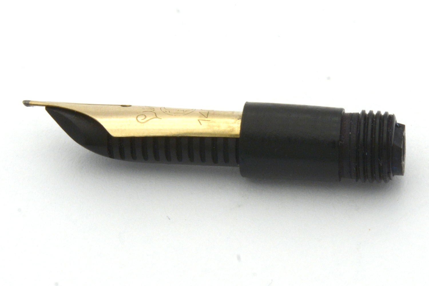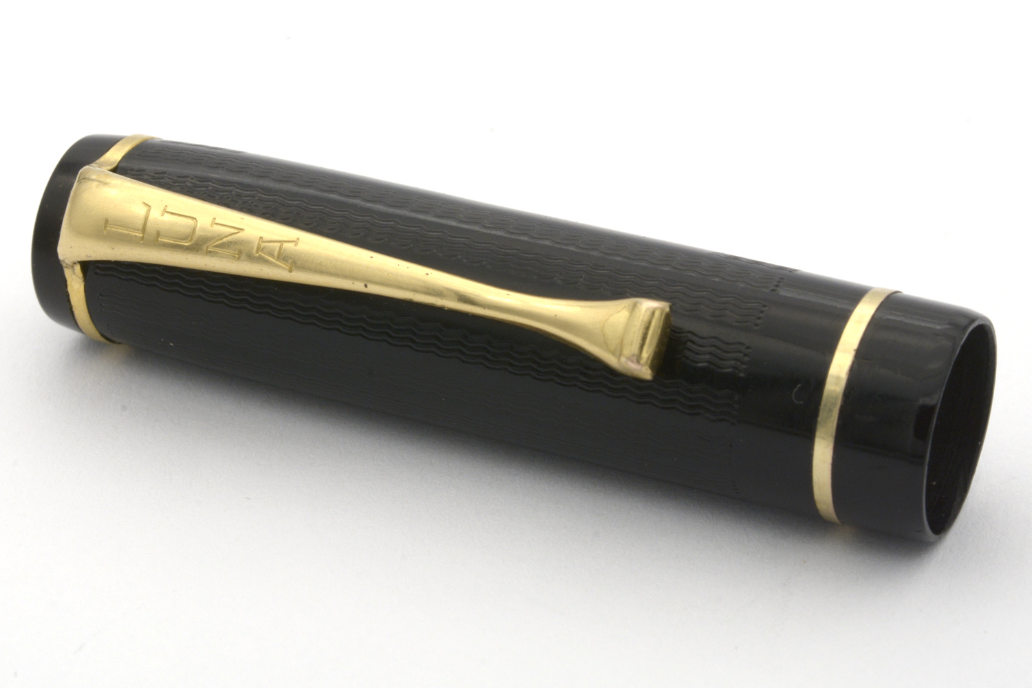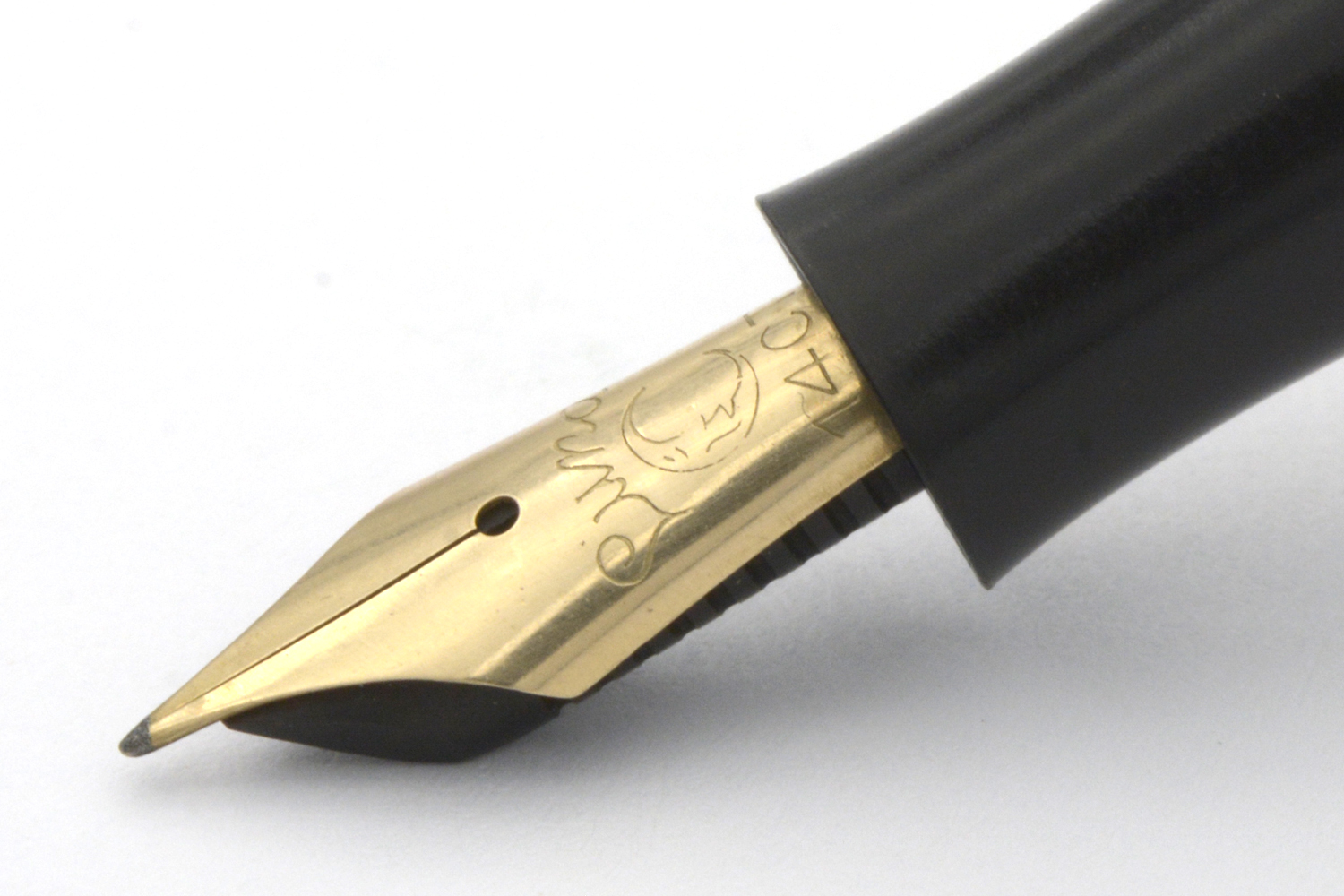 Pennans bläckfönster bär spår av gammalt bläck som jag inte lyckats få bort, men i övrigt är pennan exteriört sett i riktigt fint skick med en riktigt god förgyllning på clips och huvring och tydlig prägling på behållaren. Den enda lilla egenhet jag hittat på pennan är att det samlas en liten droppe bläck på stiftets vänstra »vinge» när pennan legat ett tag, något som eventuellt kan kommer från bläck som samlats inne i huven. Huruvida dessa droppar kvarstod efter att huven rengjorts vet jag inte eftersom pennan då lånades ut.