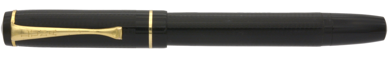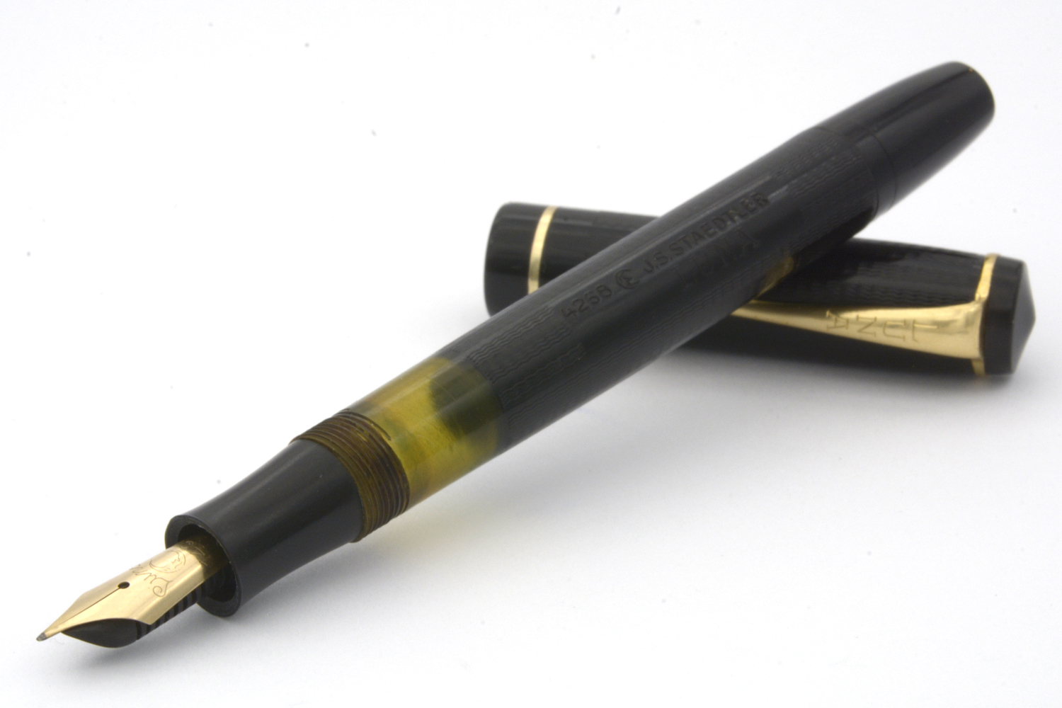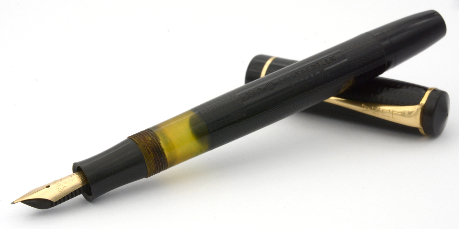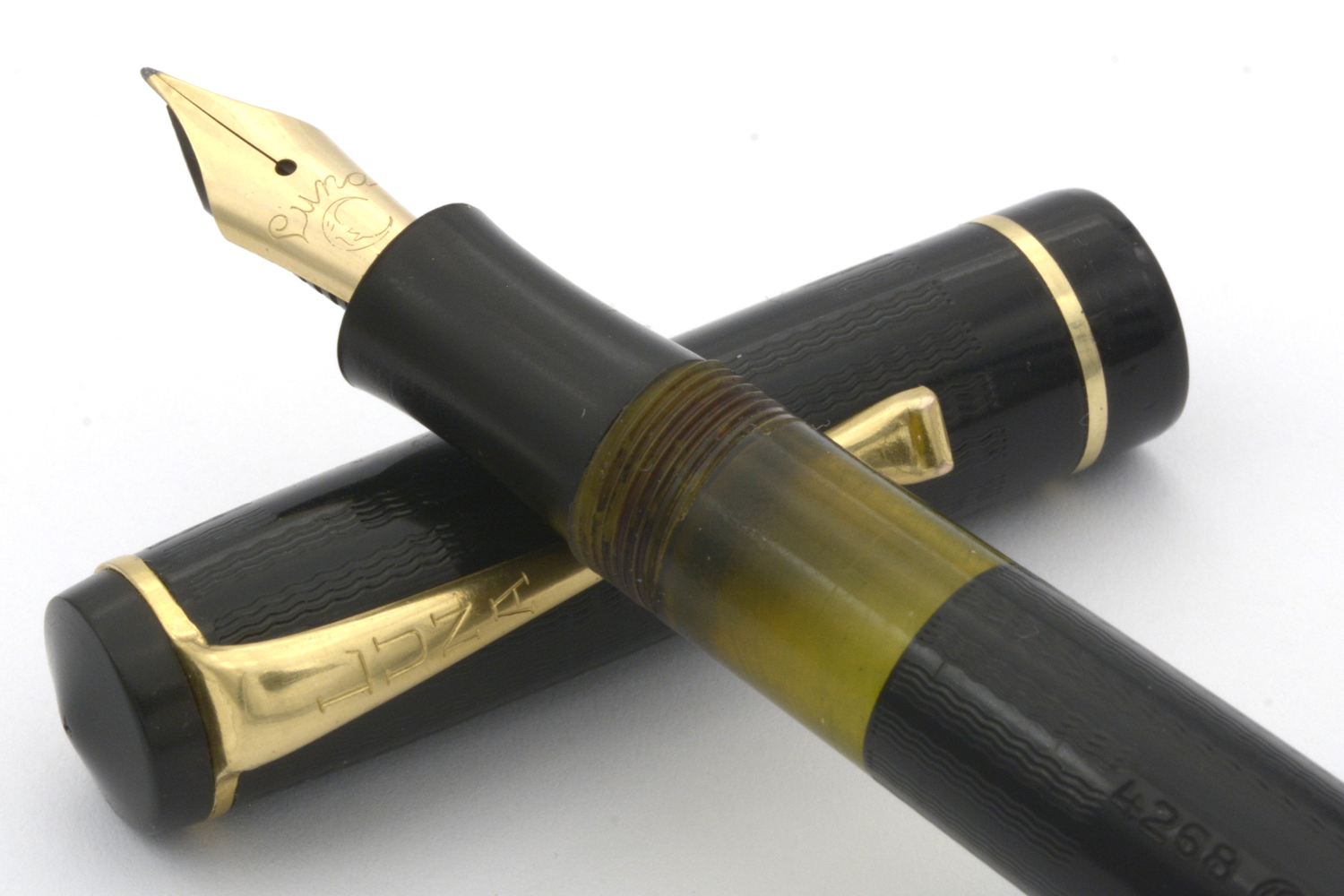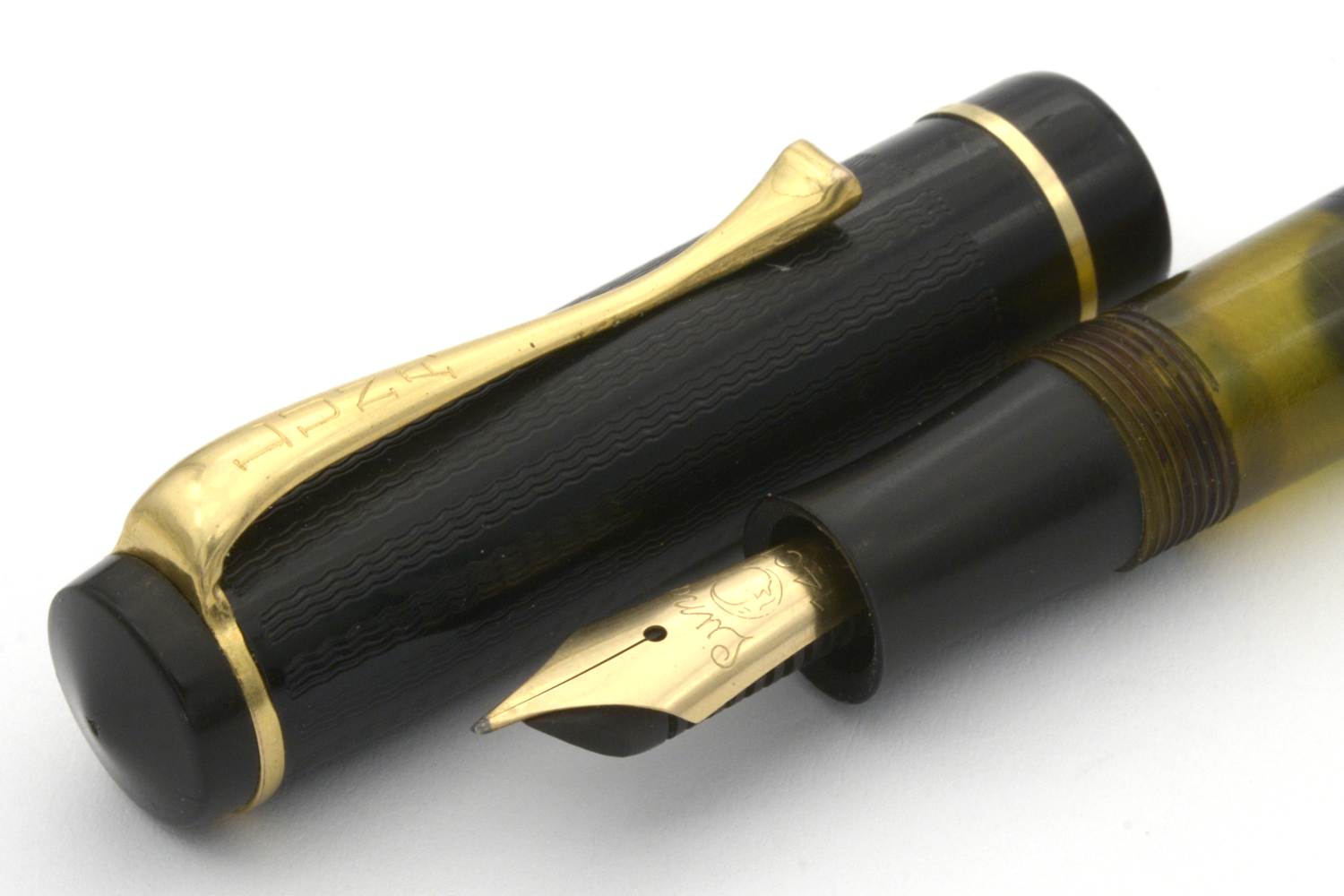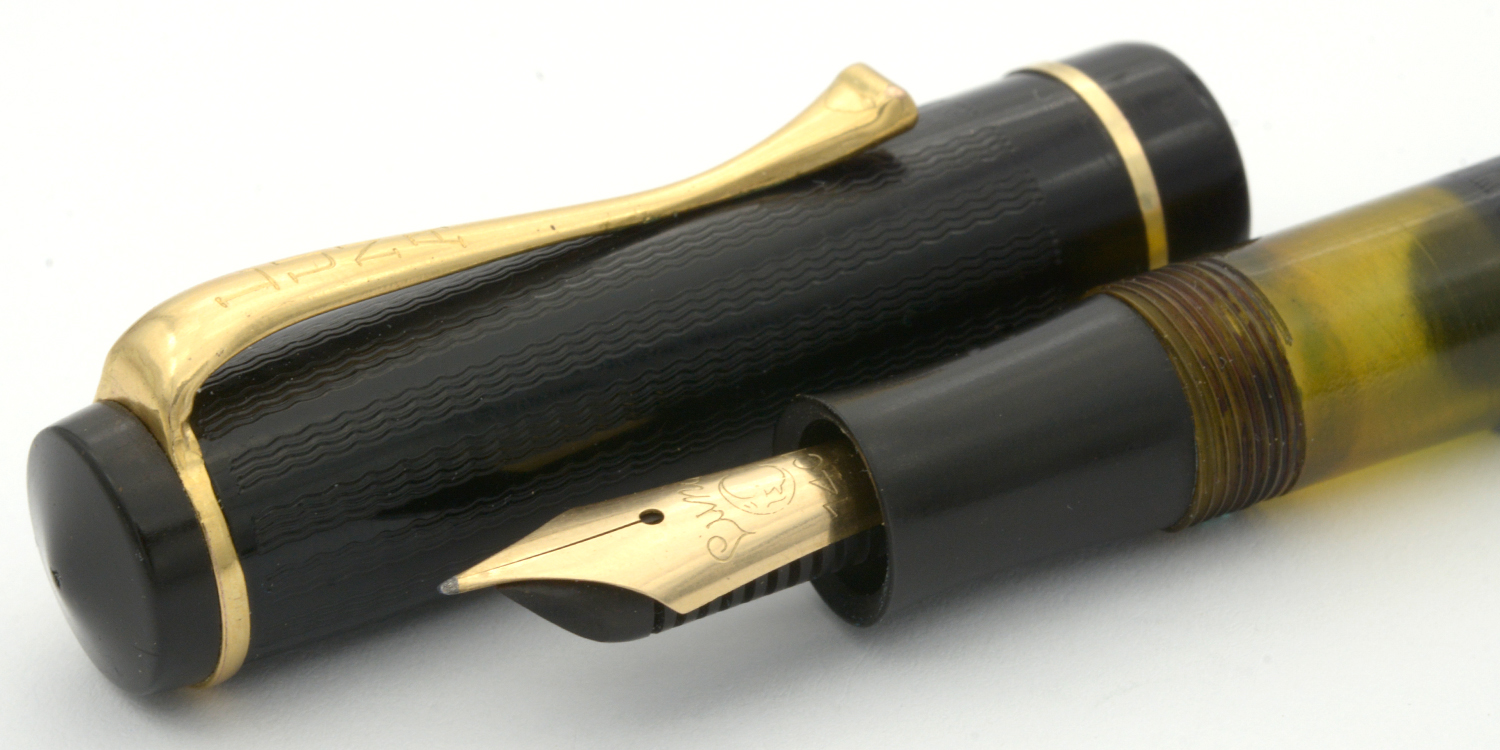 Pennans bläckfönster bär spår av gammalt bläck som jag inte lyckats få bort, men i övrigt är pennan exteriört sett i riktigt fint skick med en riktigt god förgyllning på clips och huvring och tydlig prägling på behållaren. Den enda lilla egenhet jag hittat på pennan är att det samlas en liten droppe bläck på stiftets vänstra »vinge» när pennan legat ett tag, något som eventuellt kan kommer från bläck som samlats inne i huven. Huruvida dessa droppar kvarstod efter att huven rengjorts vet jag inte eftersom pennan då lånades ut.