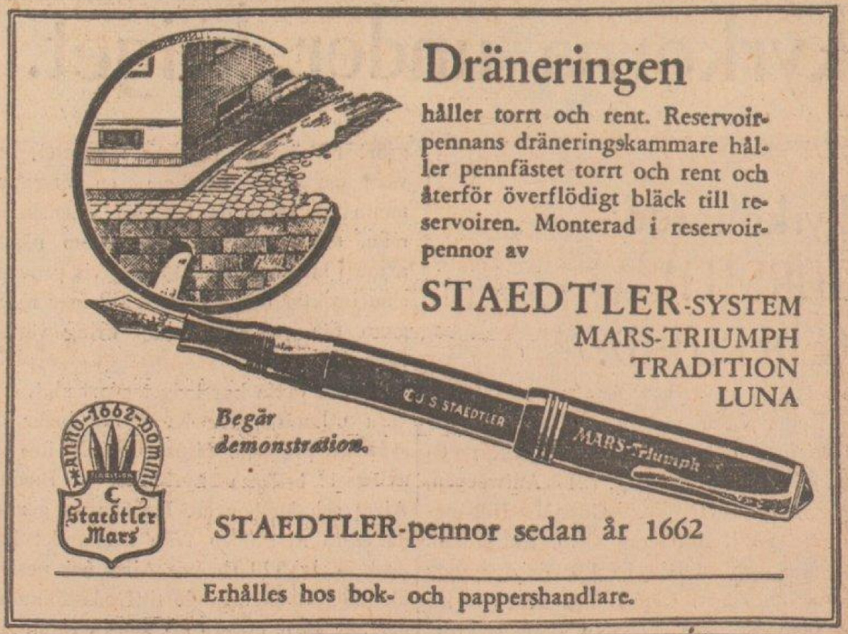 Staedtler Tradition förefaller ha varit sålts under en ganska kort tid i Sverige. Pennan omnämns i annonser från december 1940 och ett år framåt tillsammans med Mars-Triumph och Luna – och verkar under denna tid uppfattats som mellanmodell – för att därefter försvinna från annonserna. Först 1950 återkommer namnet »Tradition» men då som en tidig version av kulspetspenna med en »spets» i form av en safirkula och en lite annan design. Eventuellt såldes pennan alltså bara ett eller ett fåtal år i Sverige i början av 1940-talet. Det som talar emot detta är att pennan verkar ha tillverkats i två snarlika, men likväl olika, utföranden med olika utföranden på stift och bläckfönster.