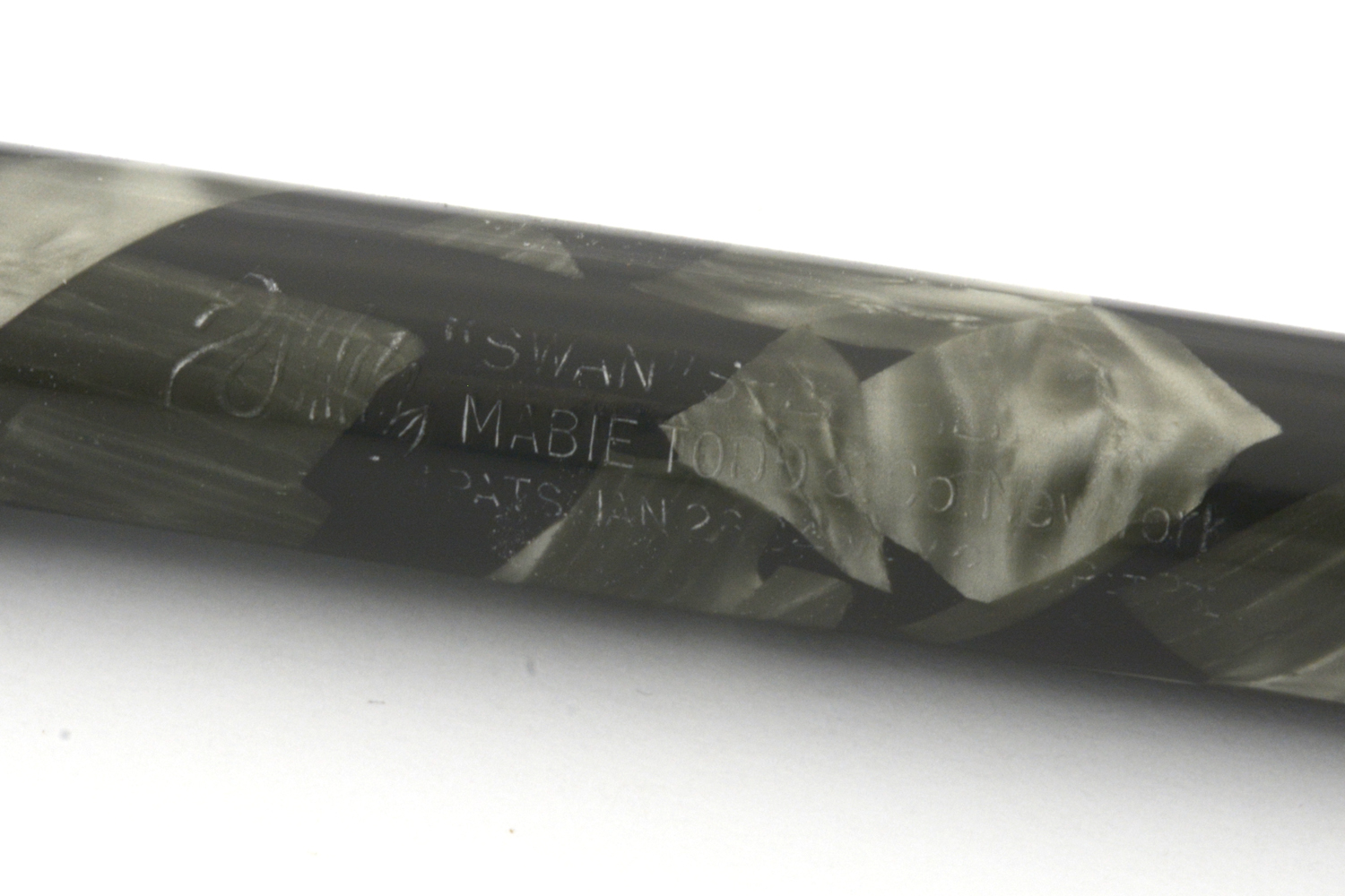 Prägling på behållaren: [Svan-logotyp] | "SWAN" SELF FILLING PEN | MABIE, TODD & CO. New York | PATS. JAN 26.04 MAY 21.18 PAT PDG